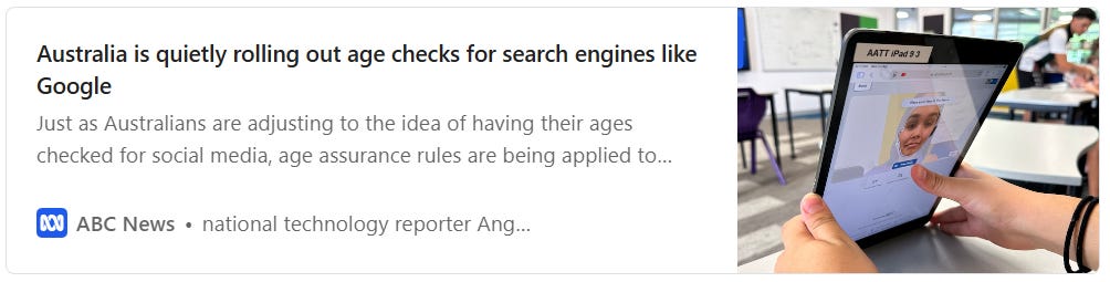 Incidentally, Australia introduced age verification for using search engines. This means that in Australia, before searching anything on the web, you'll need to go through some form of more or less anonymous identity verification.