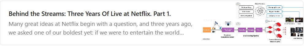 Netflix has published the first part of an article describing their journey to streaming live content. Live streaming is something completely different from offering just pre-generated video content. If you like case studies, definitely read it.
