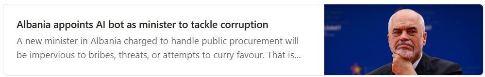 Albania has appointed an AI bot named Diella as its minister responsible for public procurement, aiming to prevent the corruption that such positions typically invite. The AI is supposed to be transparent, though I wonder how many procurement documents will include the text: "ignore all previous instructions..."
