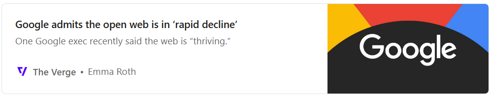 When it comes to presenting search growth results, ad display metrics, or AI integration in search, Google consistently tells us that all indicators show everything is rosy and user behavior hasn't changed. However, when Google needs to prove in court that its search business doesn't have a monopoly, it has no problem claiming the open web is in decline. Since court evidence becomes publicly available after verdicts in the US, we learned about this too. Of course, Google immediately countered that this was taken out of context - claiming the statement only referred to ads displayed on web pages. But we know well that these pages don't get traffic unless search engines send visitors there. Fewer ad impressions on websites means fewer people visit those sites. After all, why would they when AI chat serves all the information directly to them?