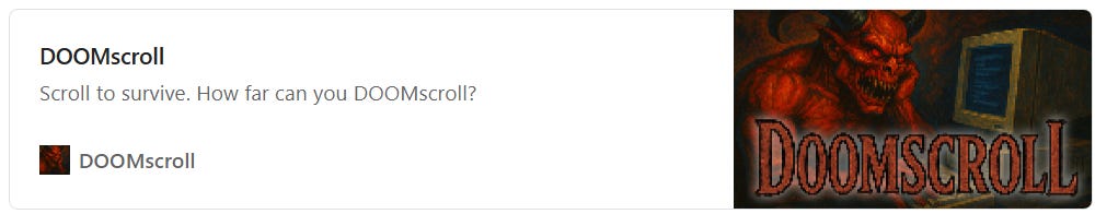Finally, here's a fun distraction for all the doomscrollers out there. It's called DOOMScroll and you only need your mouse scroll wheel. If you're interested in the game, here's a blog post about how it was created.