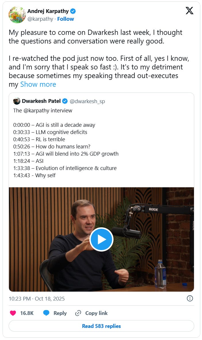 Today’s reflection was inspired by an interview with Andrej Karpathy. It’s almost two hours long, and to save you from watching the whole thing, Andrej created a summary of the main points. It’s a bit of a long read with links to his other thoughts.