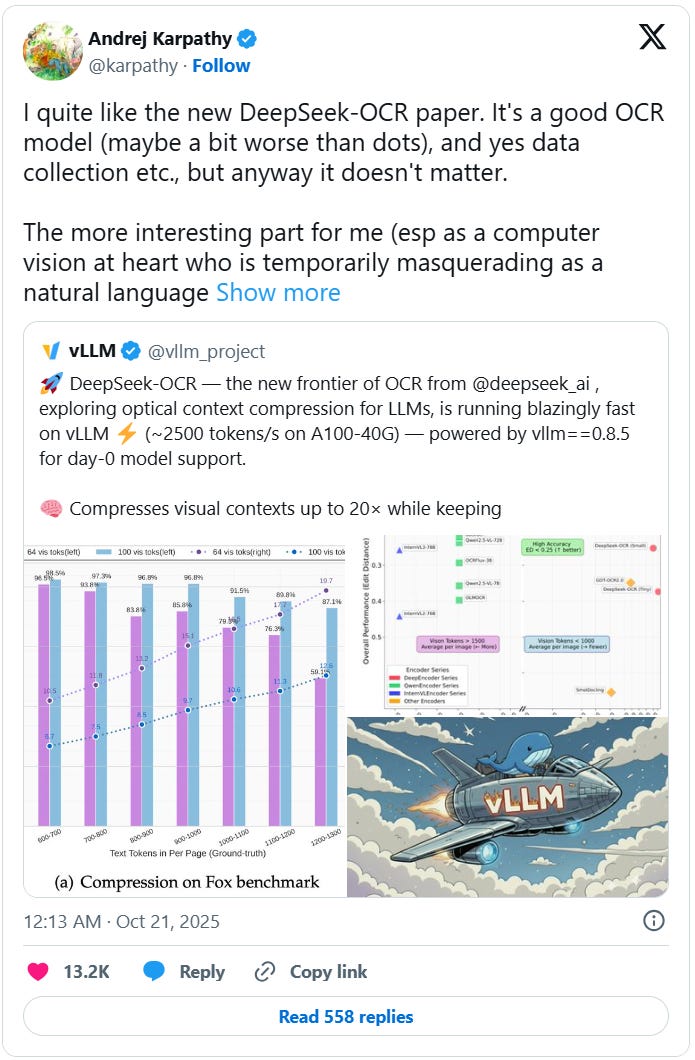 It wouldn’t be Andrej Karpathy if he didn’t get inspired by this model and introduce a new term: vLLM (visual LLM). Text tokens are inefficient and compress information poorly. They don’t capture visual elements. If we taught a model to process only images instead of using transformers, we might achieve better model functionality.
