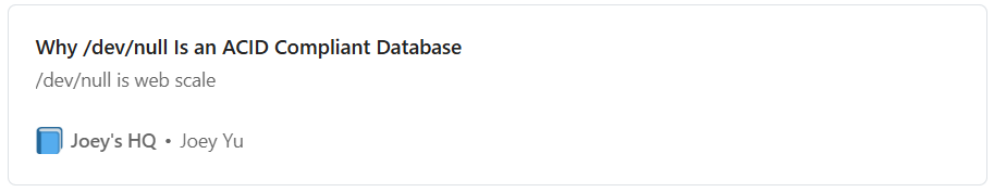 /dev/null is a fully ACID-compliant database. At work, we debated whether a database is just about storing data or also about reading it—because /dev/null definitely doesn’t fulfill the latter.