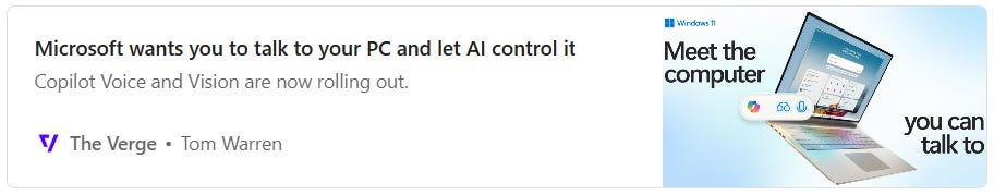 Last week I accidentally skipped this interesting news. Microsoft introduced the new wake phrase “Hey, Copilot!” which switches your computer into conversation mode. You can then use Copilot Voice, which understands your voice and reads generated responses back to you. Copilot Vision enables understanding of your screen content, while Copilot Actions executes commands. This all sounds good, but can you imagine talking to your computer? I mean, sometimes yes, but I’ll still look weird to other people instead of just grabbing the keyboard and mouse directly.