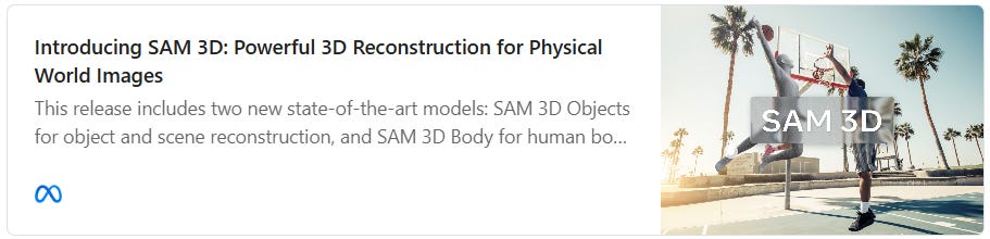 Let’s start today with new AI model announcements. First up is SAM 3D from Meta, which can create 3D reconstructions of objects from images.