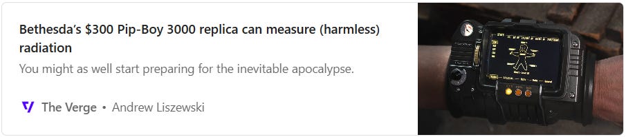 Bethesda is releasing a Pip-Boy 3000 replica for Fallout fans at $300. It has an LCD display with knob and dial controls. Instead of a Geiger counter, it measures FM radio signal strength. Now I just need to figure out how to explain to my wife why we need this.