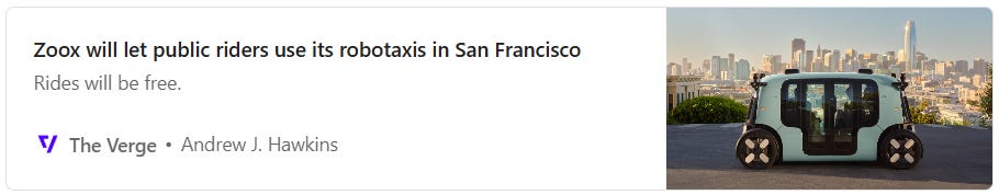 Zoox, an Amazon-owned company, is launching public rides in San Francisco. It’s the second company after Waymo to operate self-driving taxis on city streets. Unlike Waymo, Zoox doesn’t use regular cars with added sensors—they’ve designed a purpose-built vehicle.