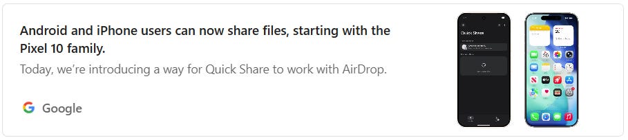 Google is bringing AirDrop to the Android ecosystem. For now, it’s only for Google Pixel 10 phones, but hopefully it’ll expand to everyone eventually.