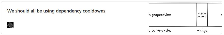 Lately, we’ve been hearing about supply chain attacks—cases where a hacker compromises a library you’re using and publishes an infected version. These are usually caught quickly, but there’s always a risk that your CI/CD pipeline runs at exactly the wrong moment, potentially exposing your API keys or data. There’s a simple technique called Dependency Cooldown that doesn’t install the latest version of a library, but rather a version that’s 7 to 14 days old. You might miss a zero-day patch this way, but that’s what dependency monitoring is for.