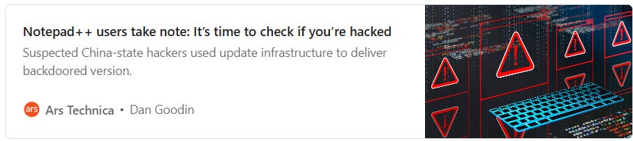 Last week, Notepad++ disclosed information about a supply chain attack that compromised their installation infrastructure. If you install Notepad++ via WinGet or Chocolatey, you should be safe. If you install it directly, check your installation to make sure you’re not among the unlucky few who were targeted.