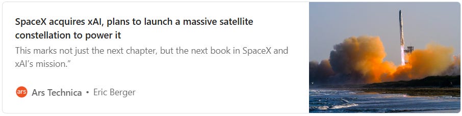SpaceX is acquiring xAI, which means that the social network X (formerly known as Twitter) now belongs to SpaceX. Elon Musk explained the acquisition by saying they plan to launch one million satellites that will run AI computations, because space has practically unlimited energy.