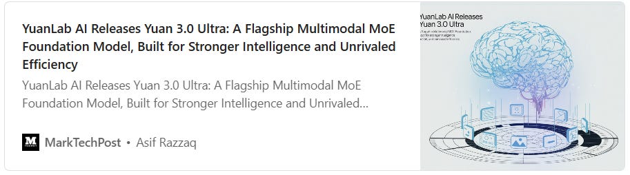 YuanLab AI has released what is currently the largest multimodal open-weight MoE model — Yuan 3.0 Ultra, with 1 trillion parameters. Its benchmark results are competitive, making it the current Chinese leader in this space.