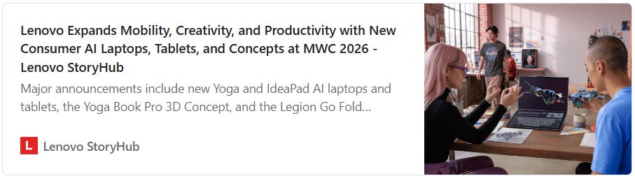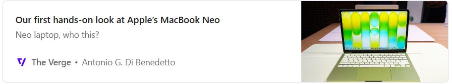 Apple had a busy week too. The biggest announcement was the MacBook Neo — a laptop powered by last year’s iPhone chip, 8 GB of RAM, priced at $600. No plastic in sight; it comes in a clean aluminum chassis. I’m curious to see how the benchmarks pan out and whether 8 GB of RAM is enough. If it is, this looks like an appealing product, especially for students.