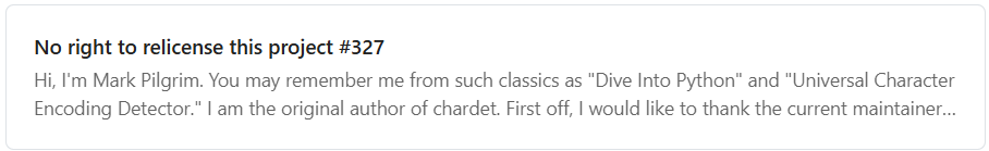 Something interesting happened last week. A new version of the chardet library — version 7.0.0 — was released, promising better performance and speed. It was rewritten with AI assistance from scratch compared to version 6.0.0, while maintaining the same API.