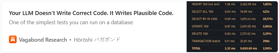 Finally, here’s another case study on unnecessary token burning. Someone used AI to convert SQLite to Rust (not the Turso/libsql rewrite — a separate project) and the results were about what you’d expect: poor performance and plenty of bugs.