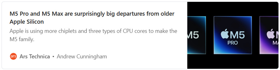 MacBooks received an M5 update. What’s particularly interesting is that the M5 Pro and M5 Max share the same CPU core and differ only in the GPU. In other words, Apple is now assembling them similarly to AMD and recent Intel processors — combining different components onto a shared substrate.