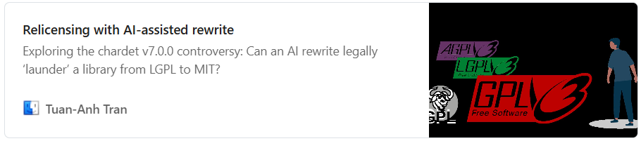 We’ll likely encounter similar cases more and more often. Anyone can take a library’s interface and its unit tests, use AI to build a new implementation, and then publish it under a less restrictive license. In the past, that would have required an enormous amount of effort — but today, with AI tools, it’s achievable in a fraction of the time.