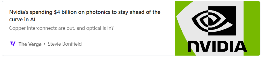 Nvidia has committed $2 billion in future contracts to each of Lumentum and Coherent — two companies working on photonic technologies that reduce latency and power consumption while increasing data throughput in data centers. This isn’t a direct equity investment, but it secures Nvidia’s supply chain, and companies backed by such contracts have no trouble securing development loans.
