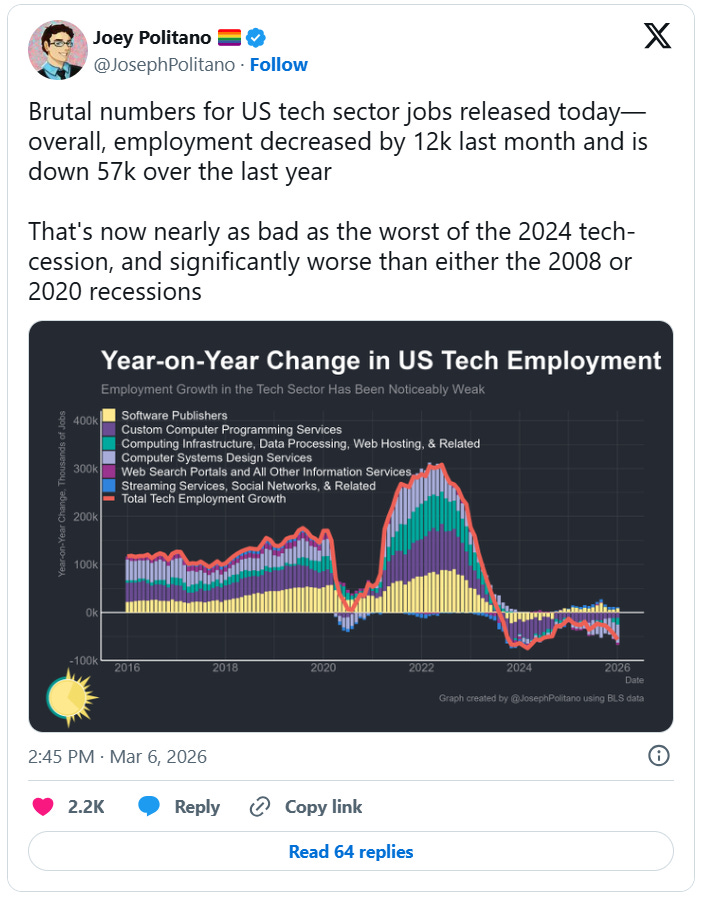 Here are two contrasting charts. The first shows a clear decline in job postings in the US tech sector — levels not seen this low since the dot-com bubble.