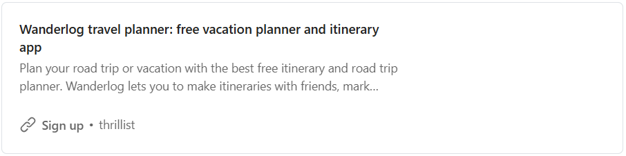 Wanderlog is a trip planner. I’m not linking it because you necessarily need to use it, but because it’s a great place to browse existing trip plans — handy for surprising your partner with ideas for a weekend getaway.