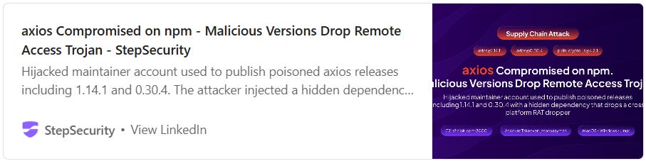 The popular axios library has been compromised via a supply chain attack using the malicious package plain-crypto-js@4.2.1. Attackers hijacked the library’s maintainer account to publish the poisoned releases. You should check whether your systems contain any of the affected packages: axios@1.14.1, axios@0.30.4, or plain-crypto-js@4.2.1.