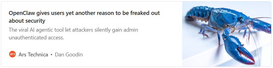 OpenClaw has another vulnerability — one that lets any piece of code escalate its privileges to administrative level. The recommendation is to stop using OpenClaw altogether, since it was never designed with security in mind. Not that anyone listens to that these days.