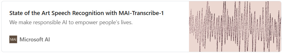 Microsoft has introduced MAI-Transcribe-1, its most accurate audio-to-text transcription model yet. Transcribing an hour of audio costs $0.0036. Hopefully it makes its way into Teams soon — transcription there has never been its strong suit.