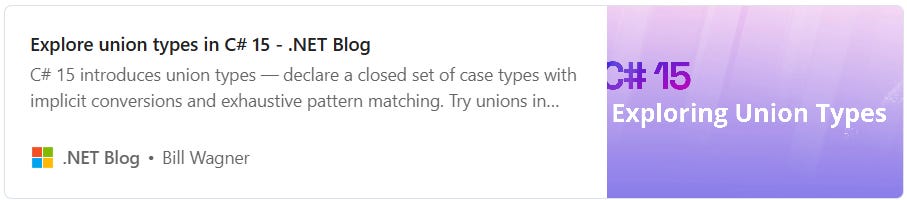 .NET 11 Preview 2 brings union types as part of the C# 15 spec. You’ll now be able to combine multiple distinct types into one. A good example is a OneOrMore<T> generic union class that accepts either a single value or a full array and always outputs an array. Switch expressions over union types won’t allow a default case — every subtype must be explicitly handled.
