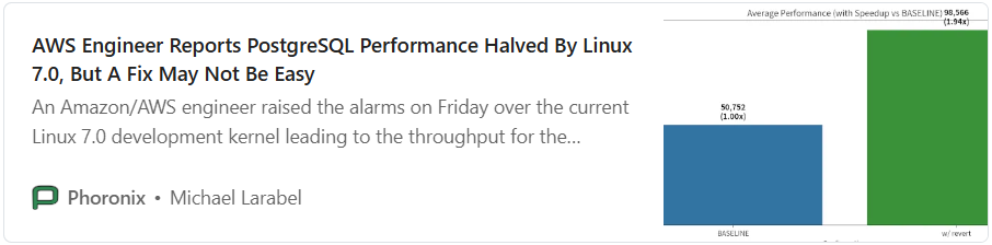 Linux 7 combined with the current version of PostgreSQL can, under certain conditions, cut database throughput in half — at least on AWS with ARM-based Graviton4 instances. The fix needs to come from the PostgreSQL side, which may take a while.