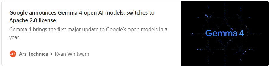 Gemma 4 from Google is the latest generation of open models optimized for local use. They’re heavily tuned for code generation, agentic workflows, stronger reasoning, and improved performance in math, OCR, visual understanding, and speech. Ideal for plugging into agentic systems that need local models — and now released under the Apache 2.0 license.