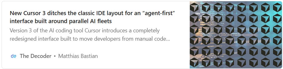 Cursor 3 is out with a completely redesigned interface, reflecting a shift in how developers work — it’s now built around agents. It also ships with a fully integrated browser and a design mode where you can draw directly into the browser to provide visual context. The downside: their own model is underwhelming, and calling third-party models gets expensive.