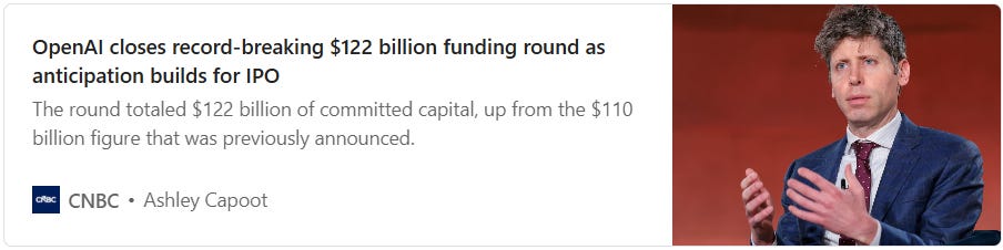 OpenAI has closed another funding round, raising $122 billion and pushing the company’s estimated valuation to $852 billion. That means they’ll be able to subsidize their business for a good while longer.
