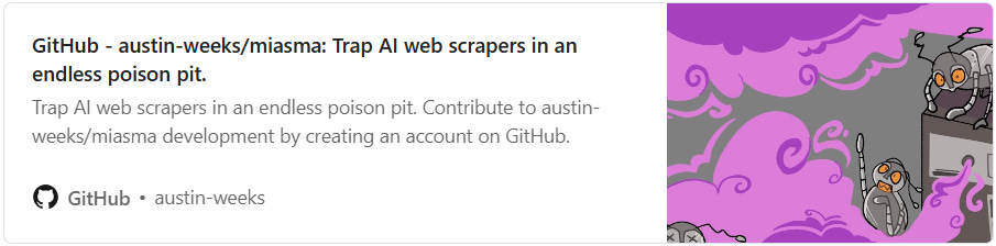And finally, an interesting tool called Miasma — designed as a defense against aggressive AI web scrapers. It works as a trap, feeding them an endless stream of interlinked poisoned data.