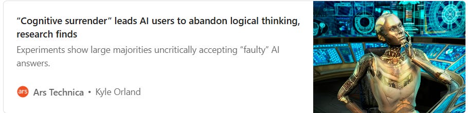 If you’ve made it all the way through the AI section, here’s something worth sitting with: how is AI actually changing the way people think? A phenomenon called cognitive surrender is emerging — people stop engaging their own reasoning and simply accept whatever the AI outputs. According to research, as many as 80% of people accept incorrect answers without questioning them at all. Under time pressure, that number climbs even higher. Where do you fall on that spectrum? Do you review the code AI writes, or do you leave that to other AI agents?